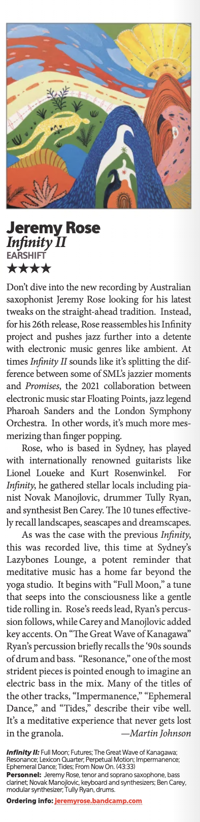 Don’t dive into the new recording by Australian saxophonist Jeremy Rose looking for his latest tweaks on the straight-ahead tradition. Instead, for his 26th release, Rose reassembles his Infinity project and pushes jazz further into a détente with electronic music genres like ambient. At times Infinity II sounds like it’s splitting the difference between some of SML’s jazzier moments and Promises, the 2021 collaboration between electronic music star Floating Points, jazz legend Pharoah Sanders, and the London Symphony Orchestra. In other words, it’s much more mesmerizing than finger-popping.